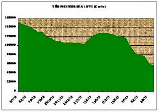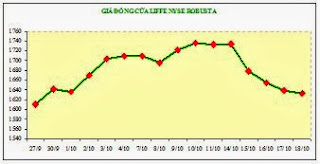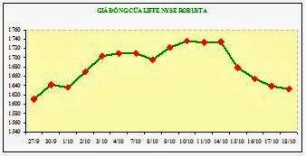 Giá sàn Liffe NYSE từ 1.733 đô la/tấn cuối tuần trước, đến khuya hôm qua thứ Sáu 18-10 đóng cửa chỉ còn 1.631 đô la, rớt 102 đô la/tấn (xem biểu đồ 3), mất toàn bộ những gì đã có từ 12 ngày nay.